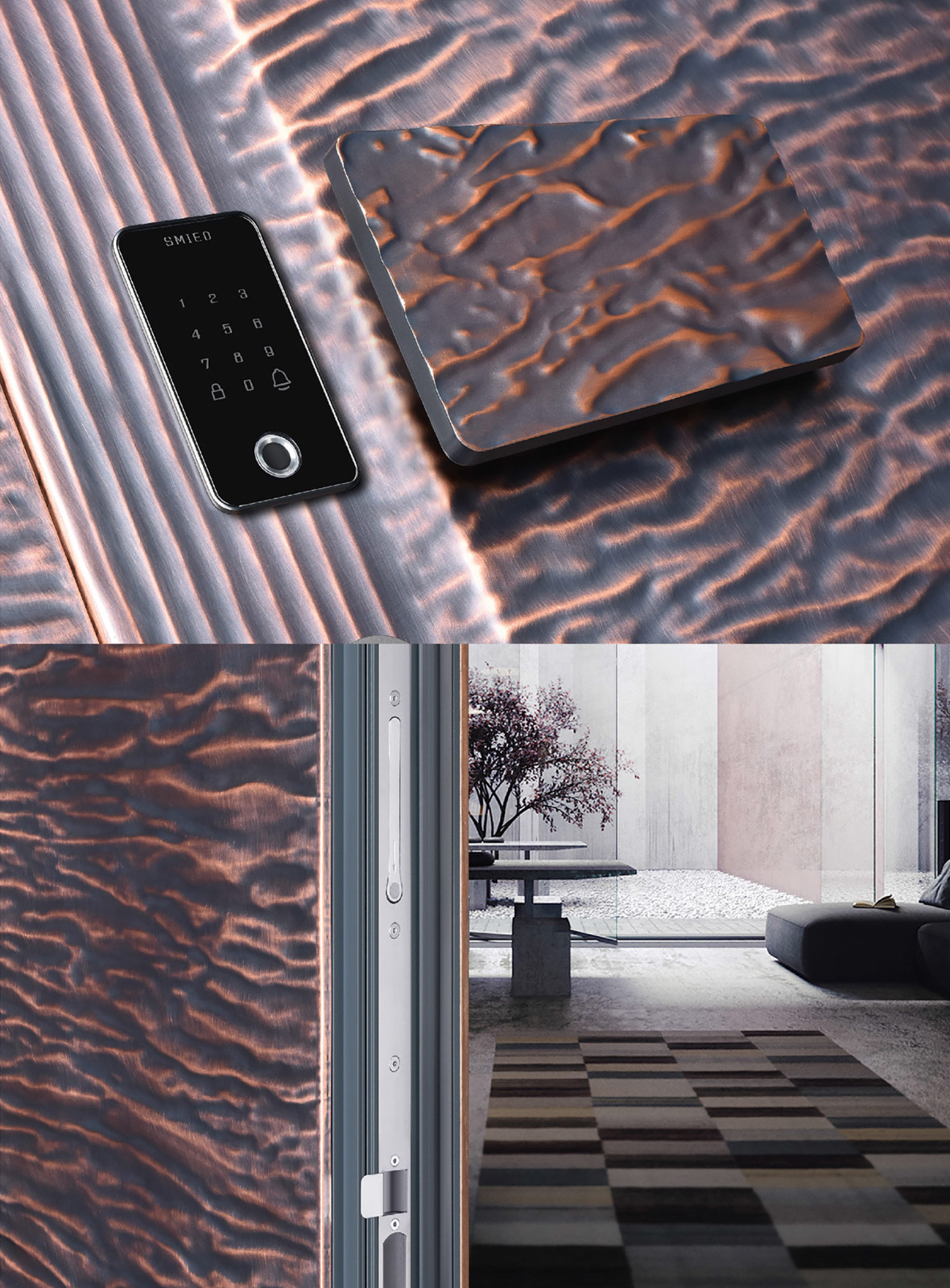 坚硬的金属与柔软的水波,孰刚孰柔,它们的结合又能带来怎样的效果。它会告诉你答案。刚柔兼并,冲撞出包容万象的大气和磅礴,如雕塑艺术品一般永恒不朽。设计给予死物生命,也重新定义了入户门——于大世界内, 包容万方,心自无敌。